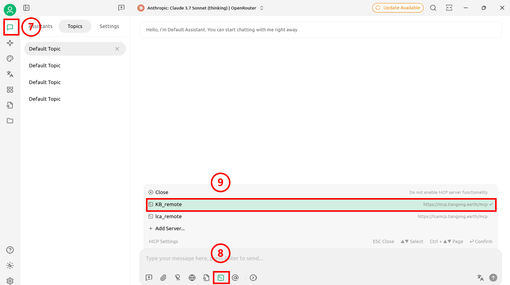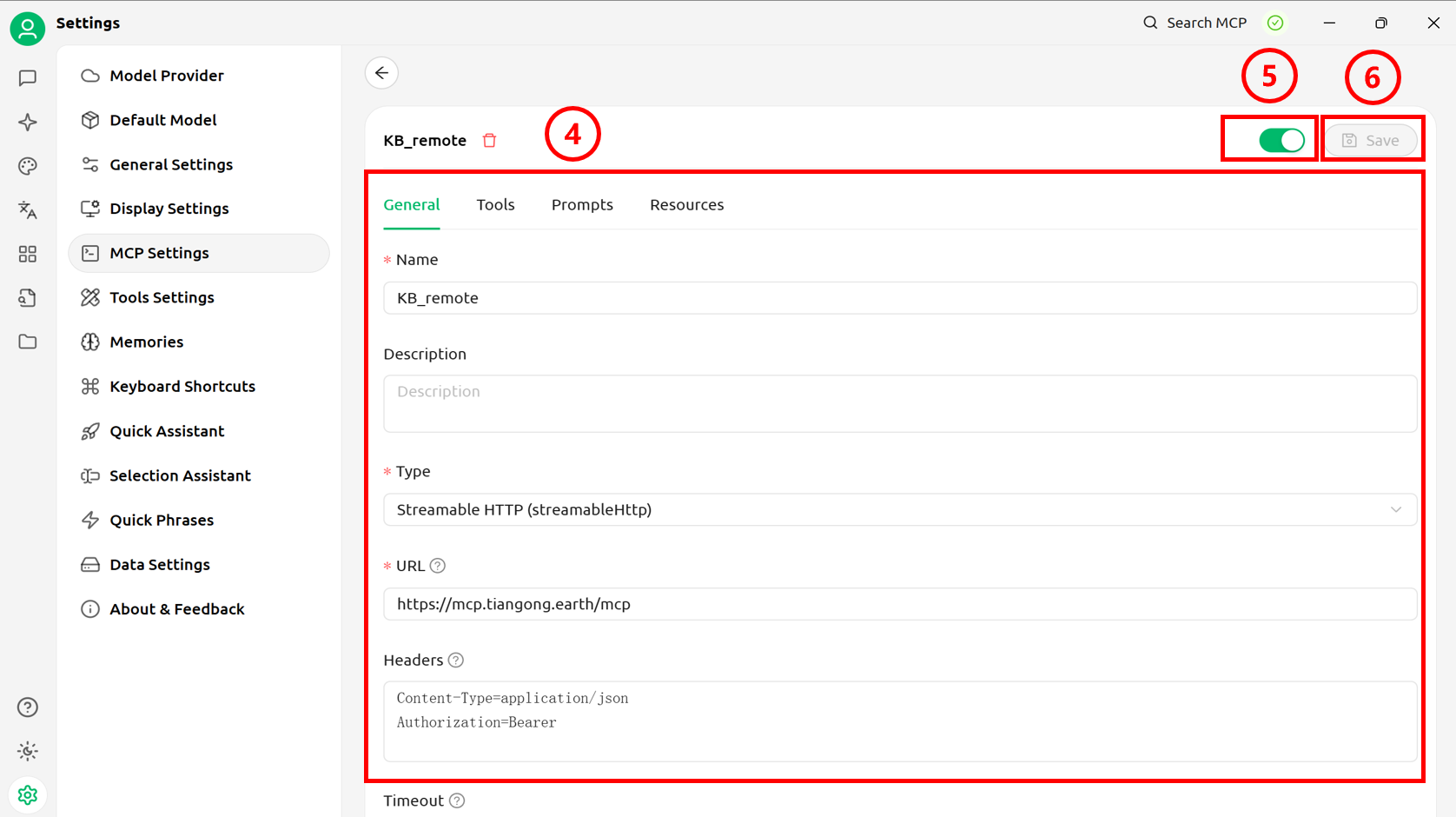 URL Configuration: Fill in the MCP Server port https://mcp.tiangong.earth/mcp.