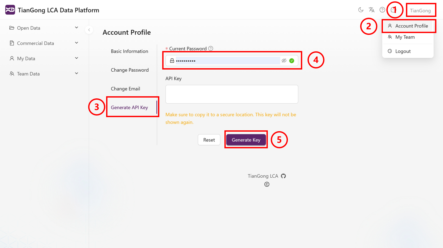 - User Login Verification: Log in using the username and password registered on the Tiangong Life Cycle Data Platform.