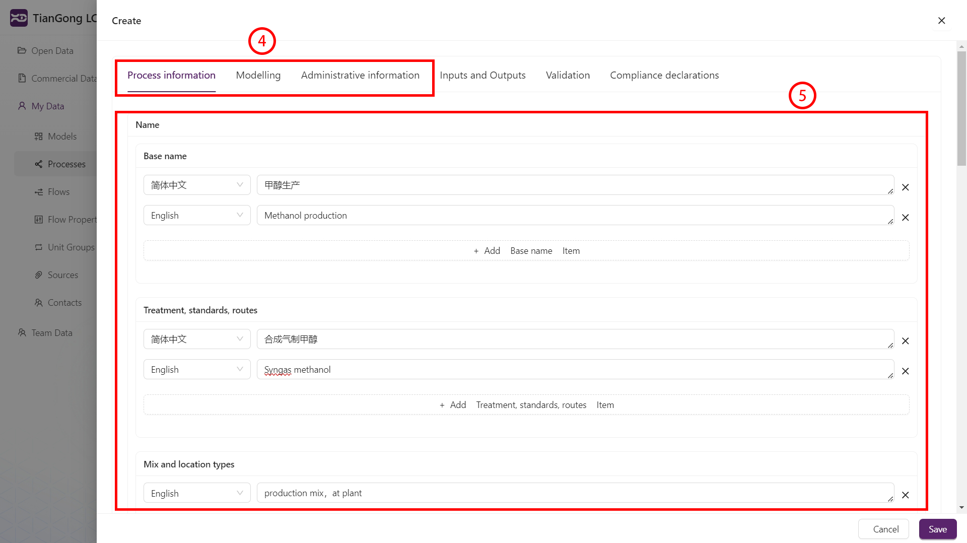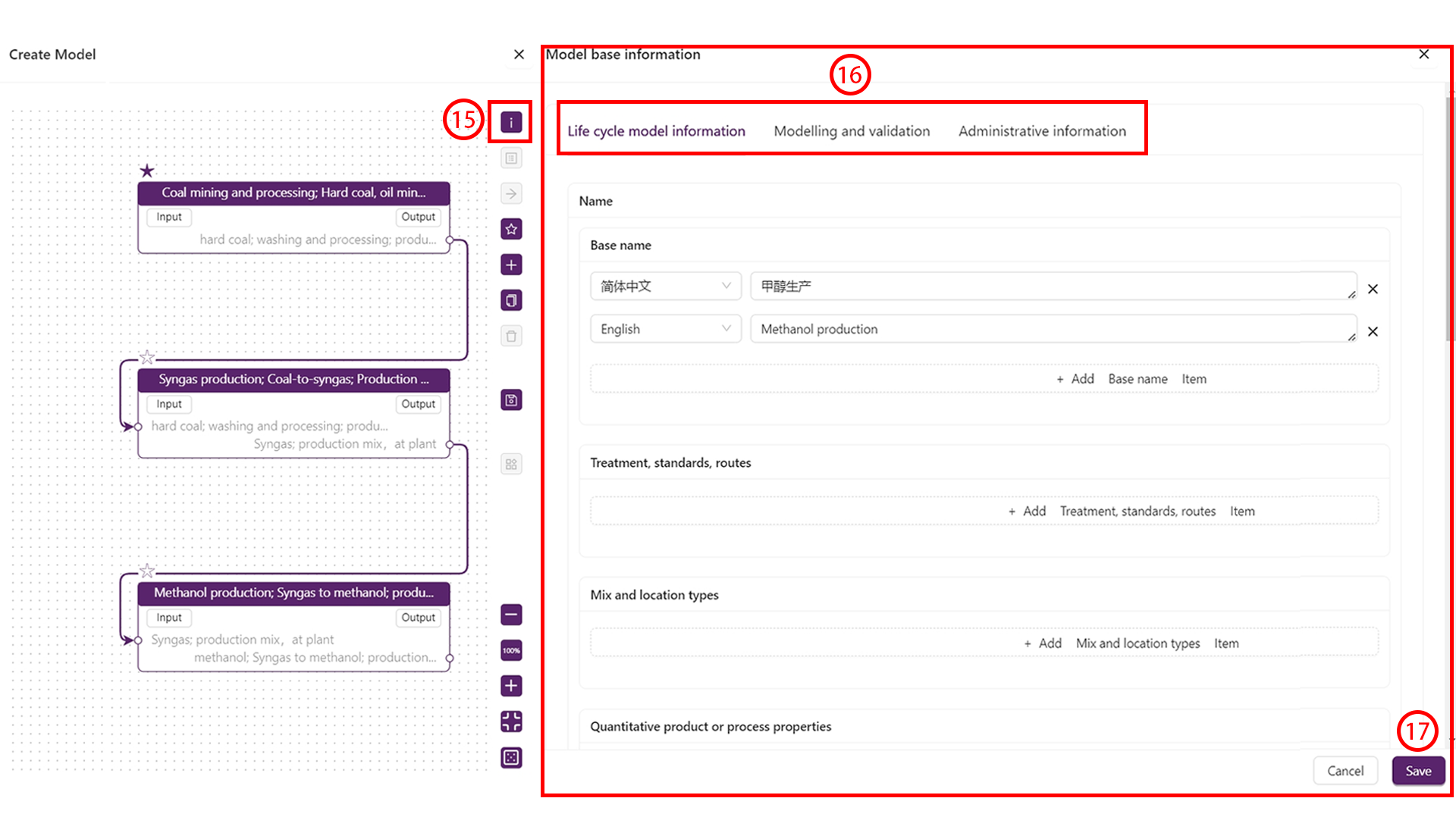 +。 - 在“过程信息”“建模信息”“管理信息”中填写字段,必要时通过“选择”面板引用已存在的数据。
